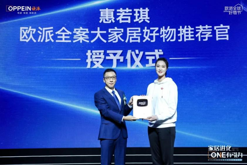 发布会现场,“欧派全案大家居好物推荐官”惠若琪分享了她对美好家居的向往。惠若琪说,全案设计适合像她一样不想操心的年轻人,可以一站式满足装修需求。欧派家居集团总裁助理现场为惠若琪授予称号。